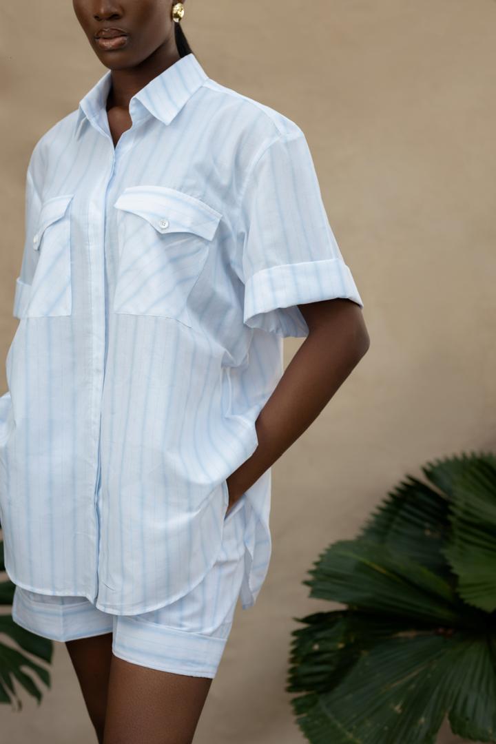 This two-piece set features an oversized button-down shirt with short sleeves and front patch pockets, paired with matching tailored shorts. Cut in a lightweight, breathable fabric, it’s designed for ease without sacrificing structure.